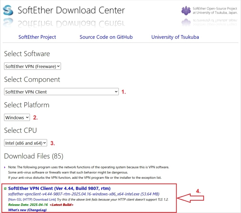 First download SoftEther VPN client. Select component, platform and CPU, and download the latest version. At the time of writing, the last version was 4.44-9807-rtm.