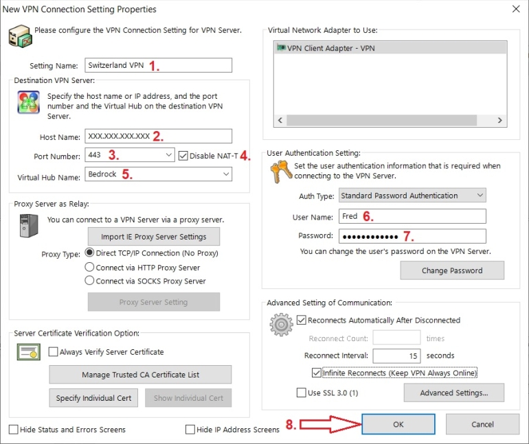 Give the new connection a name, enter the IP address of your VPS in "Host Name" field (replace XXX.XXX.XXX.XXX with the IP address of your VPS), choose a port to connect to, disable NAT-T, choose a virtual hub, enter the user name and the password, and press the "OK" button to create the new connection.