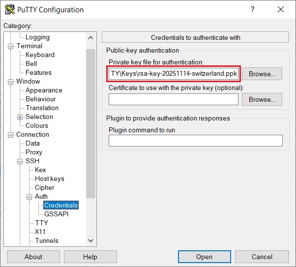 Now you can configure PuTTY to use SSH key authentication. Exit the SSH terminal and restart PuTTY.