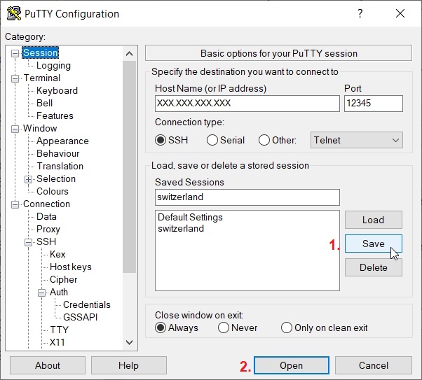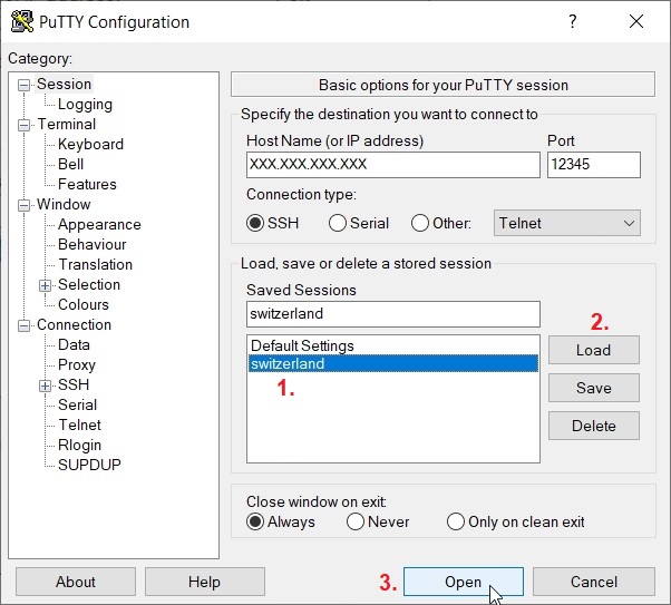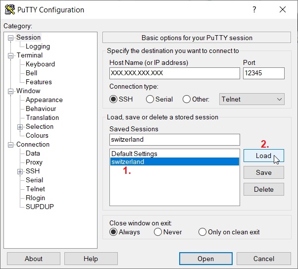 Choose "switzerland" in "Saved Sessions" section, click on "Load" button, then on "Open" button.