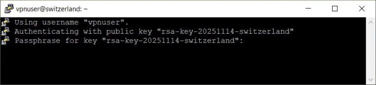 An SSH terminal will open for user "vpnuser" authenticating with public key "rsa-key-20251114-switzerland".