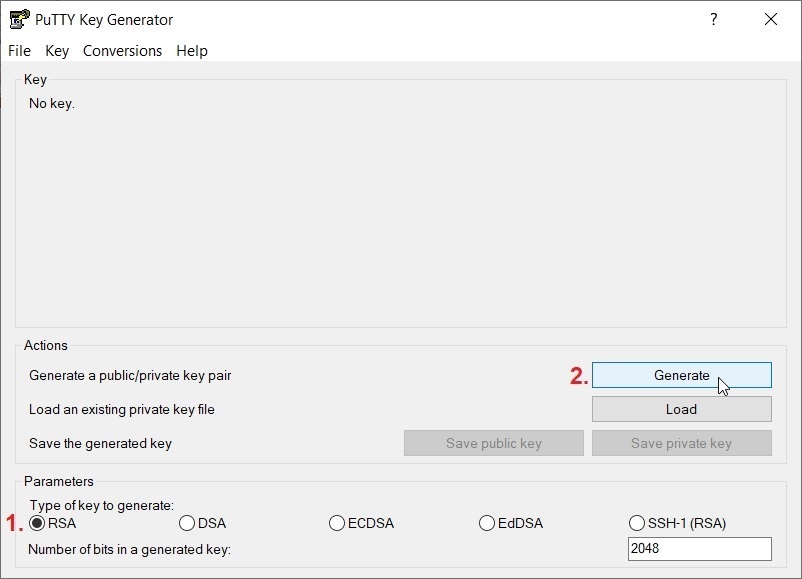 Choose a cryptographic algorithm and click on "Generate". I have chosen "RSA", for this example, but there are several cryptographic algorithms to choose from (RSA, DSA, ECDSA, EdDSA and SSH-1).