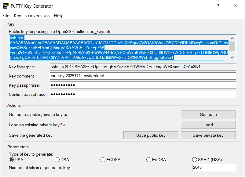 Customize the key comment, then you can add a key password, and save the keys in a folder on your harddisk. You can save them as, for example, rsa-key-20251114-switzerland.pub (the public key) and rsa-key-20251114-switzerland.ppk (the private key).