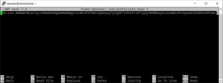 Paste the public key text into the /home/vpnuser/.ssh/authorized_keys file (right click with your mouse somewhere in the SSH terminal).